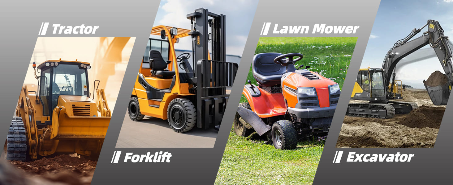 Multiple Applications for Compact Tractor, Forklift, Industrial, Material Handling, Skid Steer, Small Construction and Turf Equipment. Ideal for Ariens®, Cub Cadet®, Dixon®, Exmark®, Ferris®, Grasshopper®, Gravely®, Hustler®, John Deere®, Kubota®, New Holland®, Simplicity®, Walker® and Woods® Lawn Mowers, Bobcat® Excavators, Skid Steers, Utility Vehicles, and Wheel Loaders, Case® Dozers, Rollers and Skid Steers, Caterpillar® Excavators, Forklifts, Rollers, Skid Steers, Telehandlers and Wheel Loader, Crown® Forklifts, Ditch Witch® Trenchers, John Deere® Compact Utility Tractor and Skid Steers, and Volvo® Articulated Dump Truck: